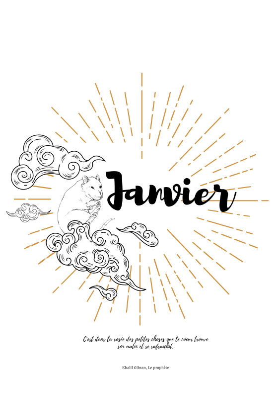Vous avez en première page le dessin du mois de janvier dont la thématique sera déclinée tous le mois sur les autres pages.