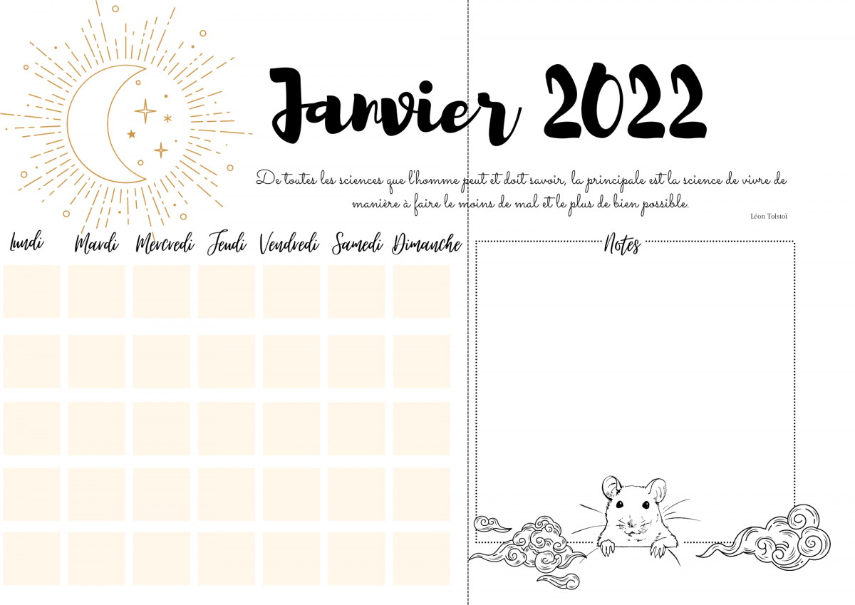 Une double page avec un calendrier du mois pour noter vos rdv, anniversaires ect et une partie notes.