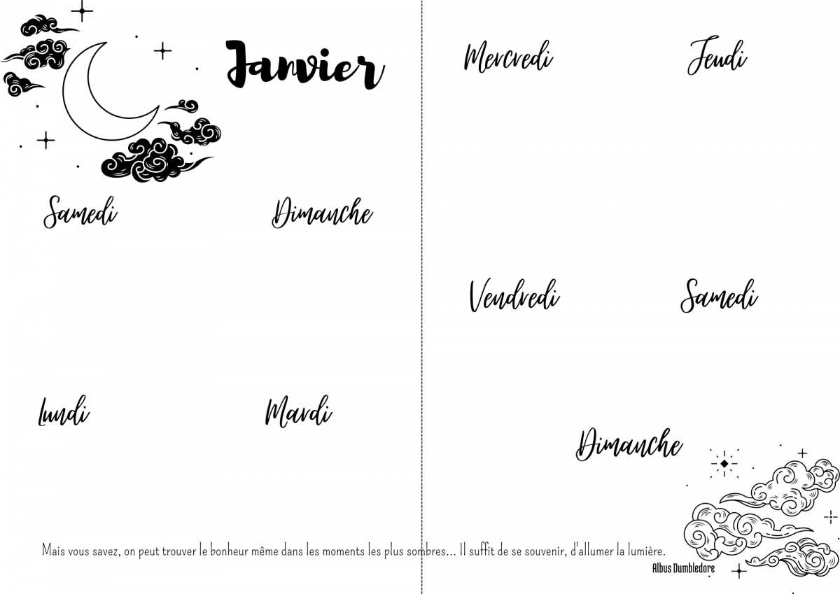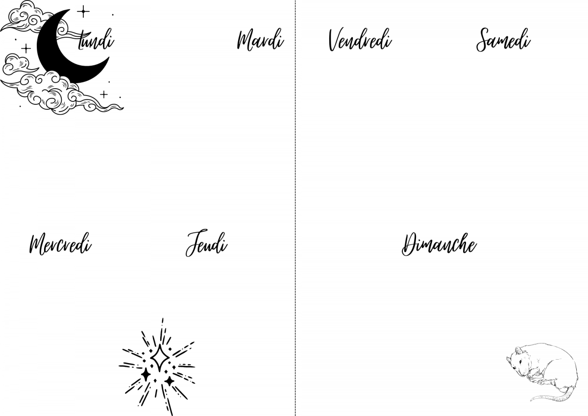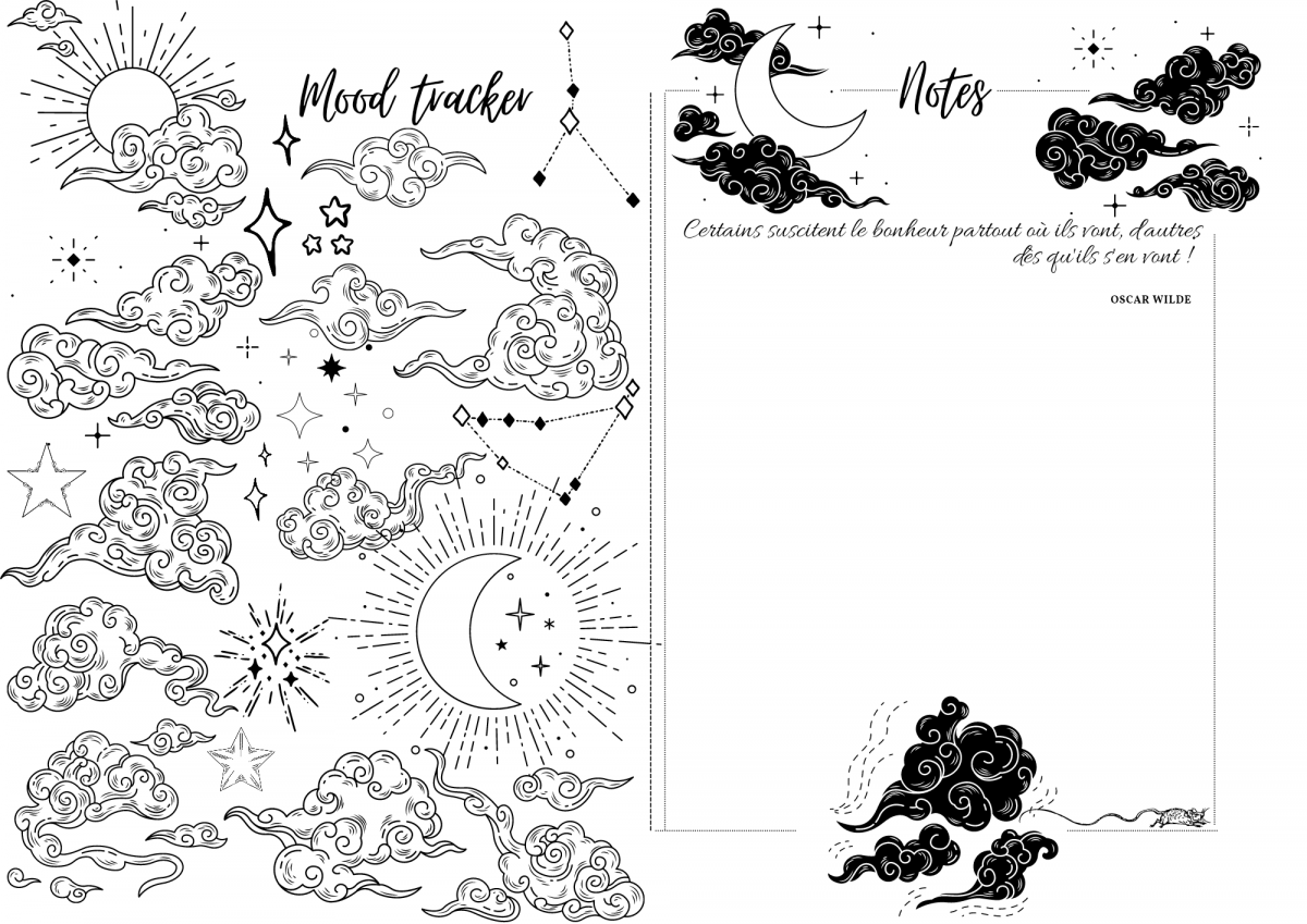 Et pour finir une double page Mood Tracker et notes. Pour la page Mood Tracker vous choisissez un élément par jour et vous le coloriez quotidiennement en fonction de la journée que vous avez passée. À vous de choisir un code couleur pour les bonnes, mauvaises, moyennes ect journées.