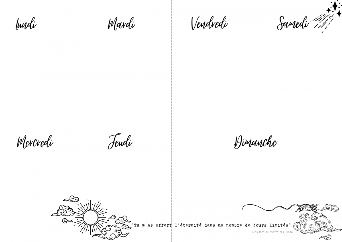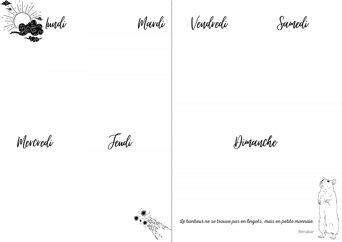 Une double page par semaine pour pouvoir noter tout ce que vous voulez plus précisément par jour.