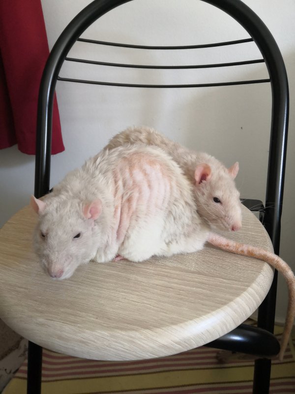Sac à Souris & Princesse Agrippine, pour note, sont deux rats de leurs fratries respectives ayant été relativement épargné par les atteintes respiratoires. La fratrie des loulous semblent « meilleure » sur le plan respi (même si plusieurs rats sont passés par cette case...) et je ne doute pas que certains aient hérité de la solidité de leurs aïeux.