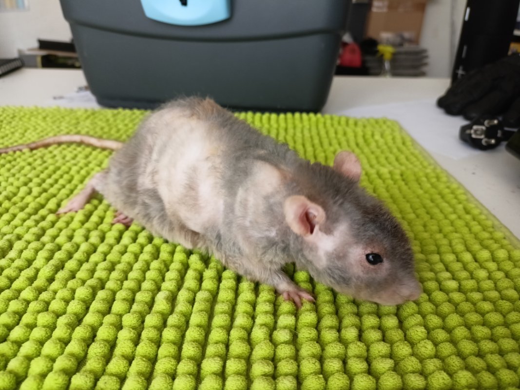 Notre dernier rat en vie, Torsten, a maintenant 31 mois, et se porte très bien. Il a moins de mobilité dans l'arrière train, qu'il traîne un peu, mais ça ne l'empêche pas de se déplacer encore beaucoup, de très bien manger et boire. Il est toujours curieux et apprécie notre présence. Son dos se dégarnit de plus en plus et sa colonne vertébrale devient plus saillante, mais il reste notre beau Torsten, avec sa jolie bouille ronde. Nous espérons qu'il reste avec nous le plus longtemps possible, tout en étant bien, évidemment.