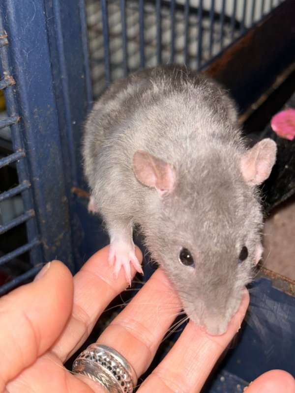 Comportement avec les autres rats :  c'est la plus jeune, et c'est un boule d'énergie, parfois un peu beaucoup pour les plus vieux qui la recadrent gentiment, et tout rentre très vite dans l'ordre. L'intégration s'était faite en à peine 30min, c'est pour dire comme le relationnel passe bien entre elle et le groupe globalement.