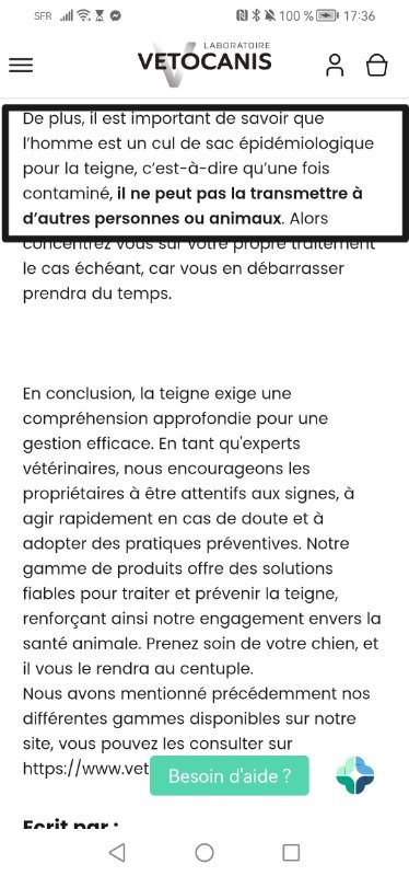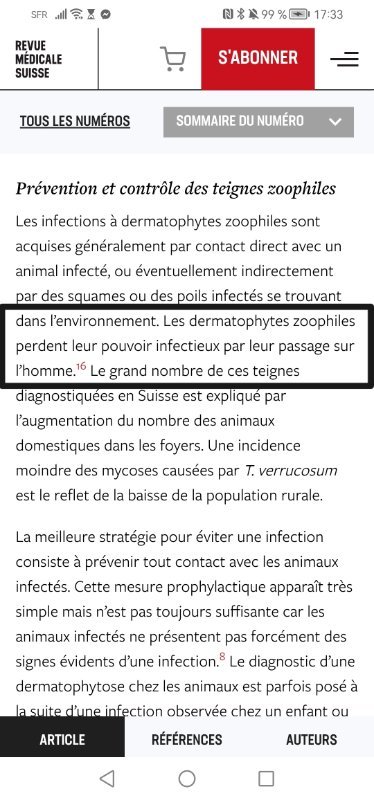 Pour ma part par exemple, j'ai eu une récidive de mon trycophyton interdigitale sur les mains fin décembre, j'ai été mis sous terbinafine par voie orale le 16 janvier. Au final j'ai depuis lundi dernier de nouvelles lesions dans le cou et la nuque, qui ne ressemble pas à ce que j'ai sur les mains, mais peut être à une teigne animale, je sors d'un rdv médecin ce matin, ma médecin m'a clairement dit que ça n'avait aucun sens car sous traitement antifongique par voie orale j'aurais pas du sortir de nouvelles lésions. Bref ! On arrête le traitement par voie oral, pour pouvoir faire des analyses et voir ce qui se passe. Tout ça pour dire que dans mon cas, niveau peau, j'attrape absolument tout ce qui traîne... Si le problème vient de mes animaux porteurs sains, bah ma fille n'a rien par exemple contrairement à moi qui commence à être touché par tout un tas de truc de merdique !