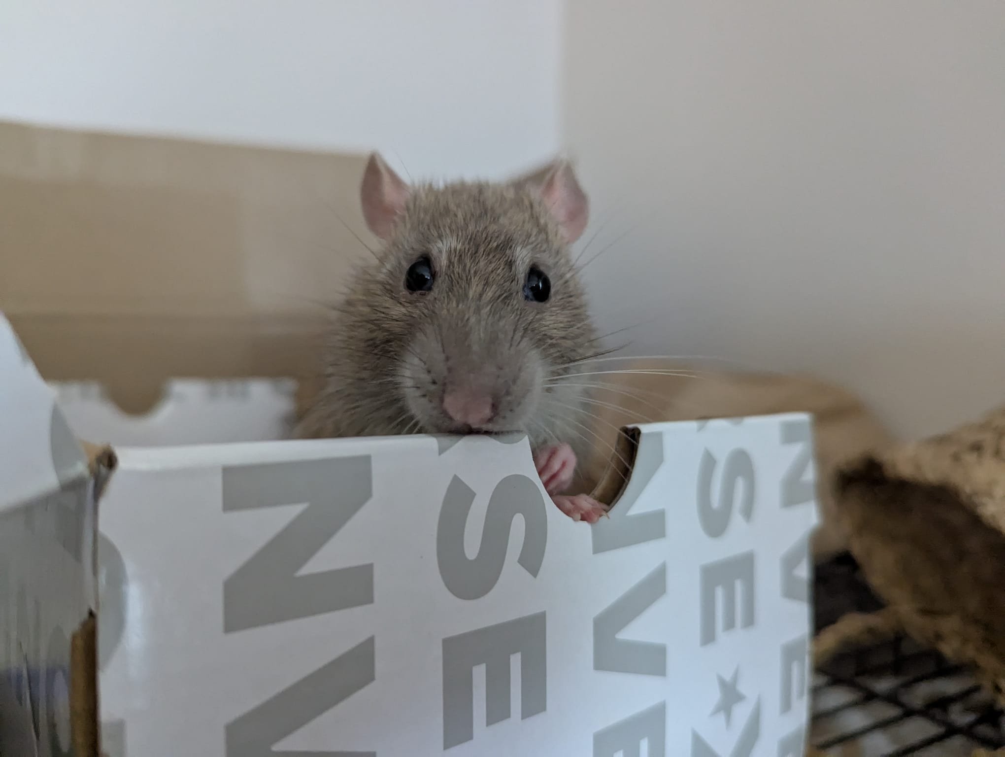 Suite au décès de son compagnon, Qilby, le 27 septembre, ma petite patate Shinonomé se retrouve seule.  Je ne souhaite pas reprendre de rats (trop de tristesse à chaque départ...) et ai donc pris la décision difficile de lui chercher une nouvelle famille aimante et, surtout de nouveaux copains car elle semble souffrir de la solitude depuis le départ de Qilby... Elle est âgée de 14mois et est en pleine forme. Elle est très curieuse, elle aime se promener et découvrir de nouvelles cachettes (elle est habituée à sortir de sa cage). Elle a vécu sa vie chez nous avec un compagnon qui était assez timide et sauvage et l'intégration s'était passée sans encombre. Elle a côtoyé, de plus loin, à travers les barreaux, mes trois autres rats qui étaient dans une cage séparée. Elle est sociable avec les humains (manipulée depuis toujours, se laisse porter et attraper sans soucis, monte sur les épaules, vient voir son humain quand on l'appelle..) même si elle n'est pas particulièrement "câlins". Elle mange des croquettes et de la nourriture fraiche.