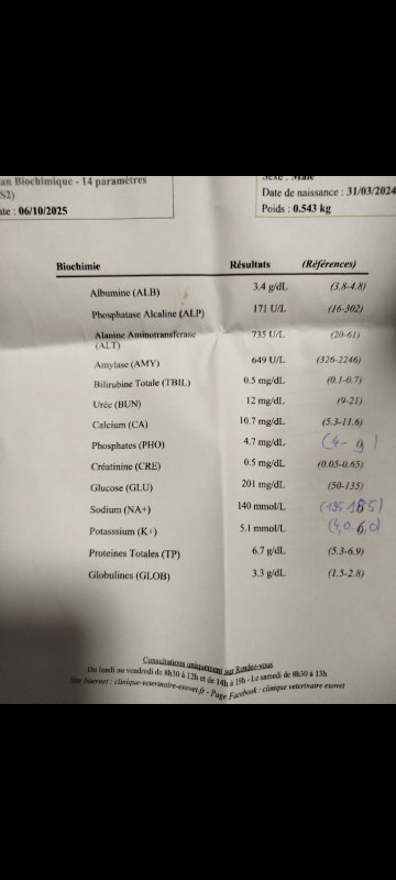 Les alat sont carrément au taquet, c'est le seul signe hépatique, d'où le fait que le vétérinaire dit que ce n'est pas une insuffisance hépatique, d'autres valeurs seraient touché sinon