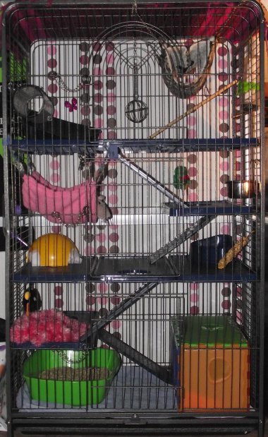 mes ratoux sont actuellement dans une petite cage à lapin provisoirement pendant les vacances (cage chez mes parents...) j'y ai mis un tissus qui fait hamac-étage ou ils aiment y faire dodo...