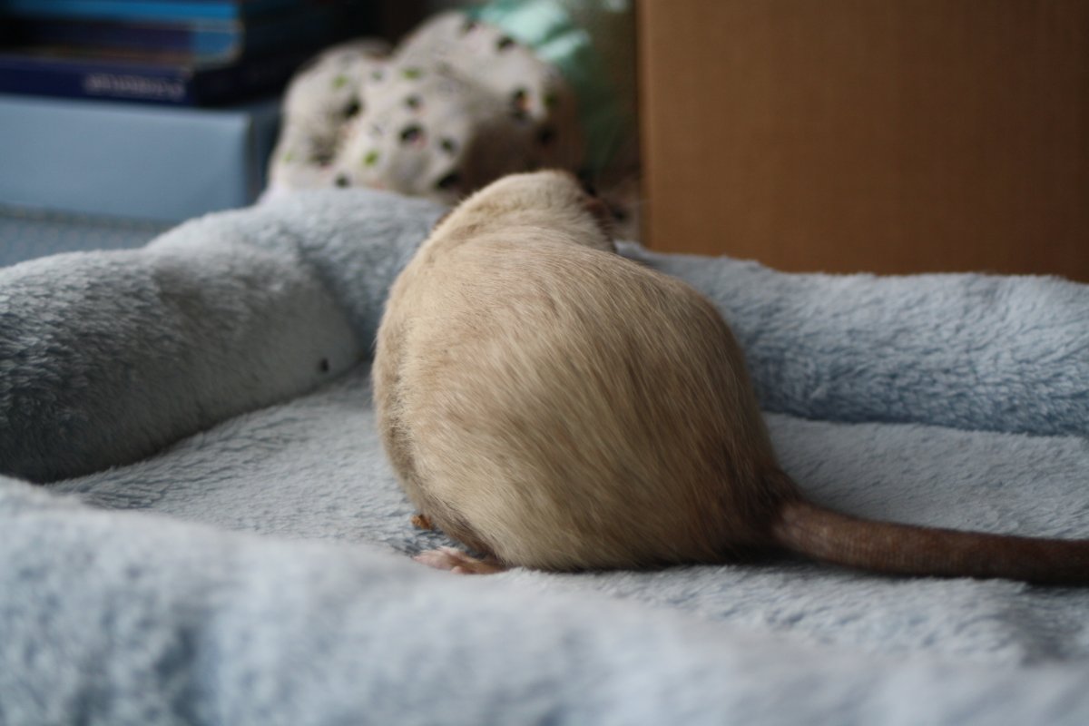 J'adore envoyer les photos de son évolution à l'amie qui l'a sauvée, n'étant pas ratouphile (ni même bestiolophile) à la base elle ne savait pas que ce genre d'évolution était possible, du coup elle hallucine à chaque fois. (Et vu qu' elle l'a récupérée dans le Sud en pleine canicule, elle était blanc immaculé avec à peine une pointe de pinceau chocolat sur le bout du museau à l'époque de son passage chez elle, il faudrait que je retrouve les photos pour comparer).