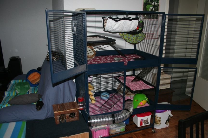 Ma 1ere cage maison était plus comme celle d'Ancalïme, avec des parois en plexi, mais j'avais tellement peur à chaque fois qu'il s'agissait de la déménager que ça pète que j'ai préféré bannir le plastique quand il a s'agit d'en construire une plus grande. Le seul soucis que je trouve au métal par rapport au plastique, c'est niveau esthétique, ça fait un peu batterie d'élevage (et puis du coup l'intérieur de la cage est assez sombre, mais les rats aimant en général la pénombre, ça n'a pas l'air de les déranger au contraire).
