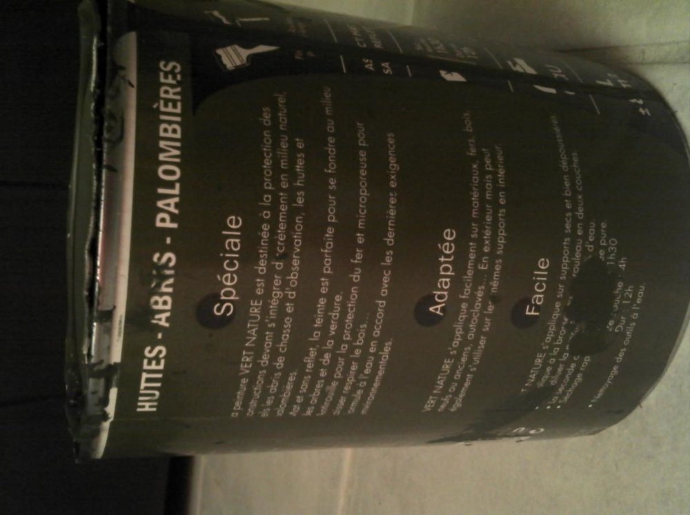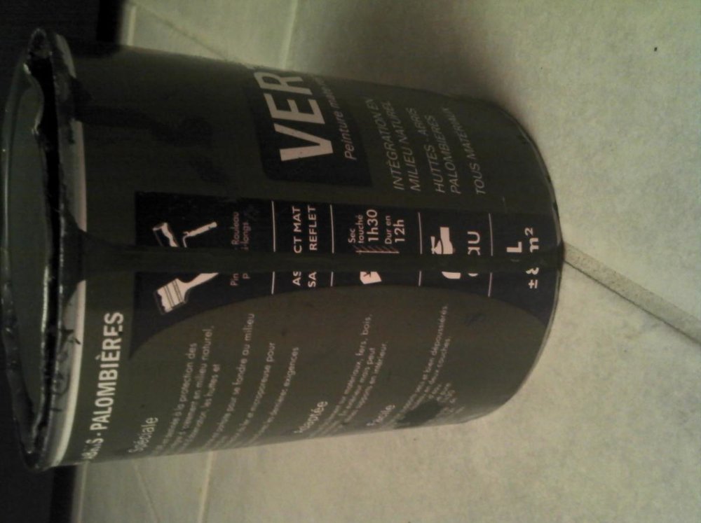 Voila la peinture avec laquelle on a repeint notre résidu de volière en mai 2012 (2 couches). Aucune retouche depuis! Avec, des photos de la-dite volière pour que vous ayiez une idée de la couleur!