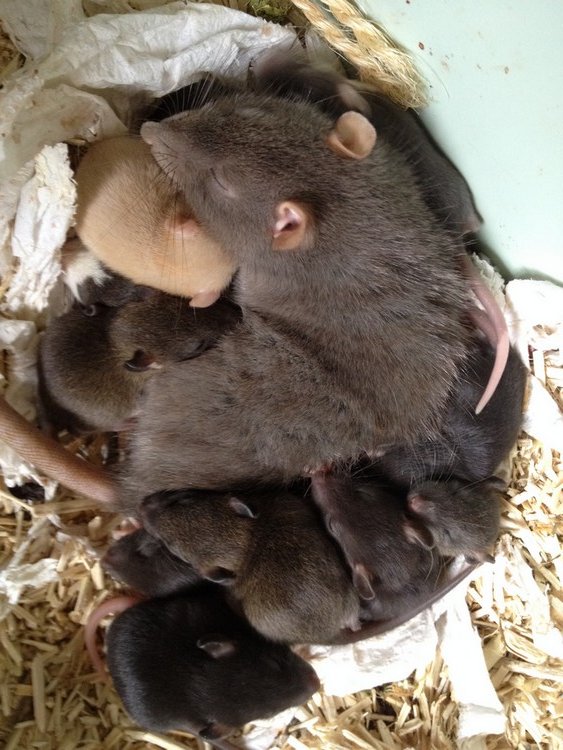 Il y a un peu plus d'un mois, nous avons pris 2 rattes dans 2 animaleries différentes (erreur mais nous l'avons appris trop tard...). La première (Dûrga) s'est avérée gestante, et a donné vie à 13 bébés il y a maintenant 3 semaines. Nous avons laissé nos 2 rattes dans la même cage et tout s'est passé à merveille ! La deuxième ratte (Brooklyn) prenait soin des bébés comme si c'était les siens, les lavaient, dormait toujours avec eux... Son comportement était un peu suspect, tellement elle en prenait soin.