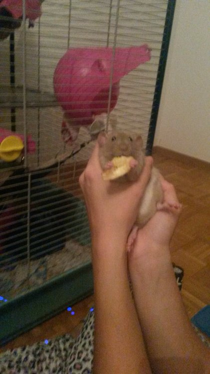 Apart sa tout va bien, elles ont compris que sifflement = friandises ou antibiotique et viennent directe. Toujours bisouteuses à souhait, Isis a une immense confiance en nous (elle mange ses croquettes assise ou couchee dans nos mains, sur la 20aine de ratte que j'ai eue c'est la 2eme a faire sa trop chou :) ), de vraies piles qui recopient les conneries de ma petite Tsuki (s'évader en douce quand je change l'eau ou croquette, ronger le mur...), de petites exploratrices et joueuses :)