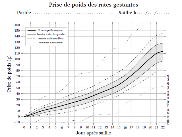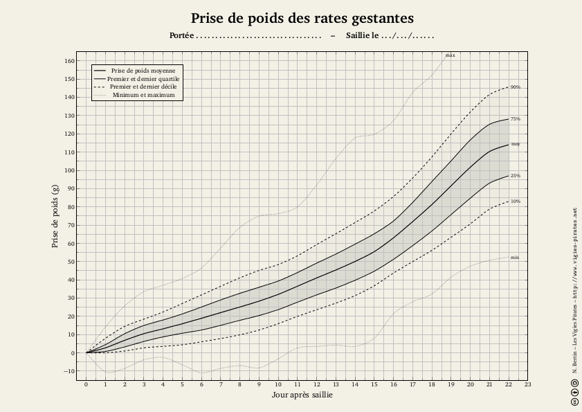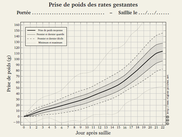 Suite aux premières courbes publiées pour les RA en 2014, j'ai mis à jour les courbes moyennes de prise de poids pendant la gestation, avec plus de données qu'à l'époque (200 rates contre 131, et quasiment le double de pesées). Comme je sais qu'il y a régulièrement des questions au sujet de la prise de poids, et de plus en plus de personnes qui utilisent la base de courbes pour noter les pesées de leur rate, je viens vous poser ça ici :)