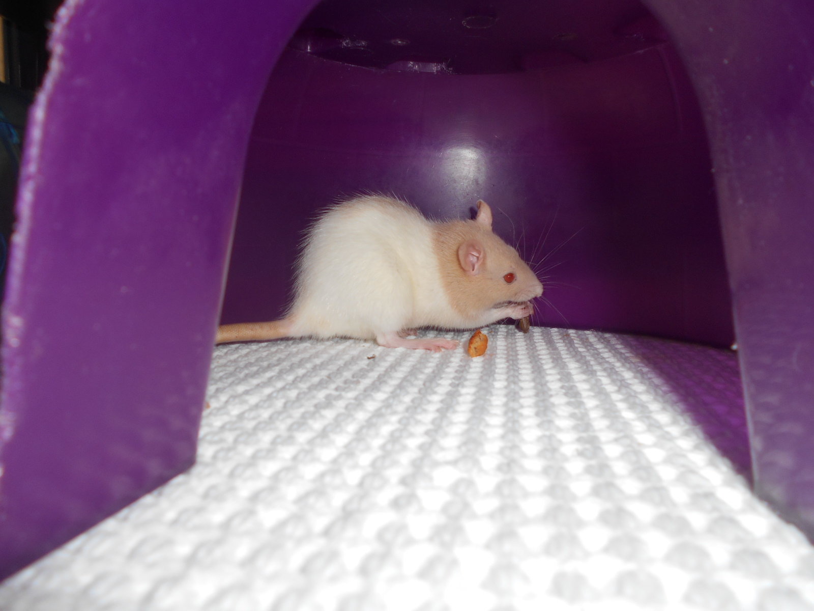 Il à été très flippé par les autres rats suite à ça, mais en rallongeant beaucoup l'intégration cette peur est passé, même si il hurle souvent quand les autres tentent de le soumettre.