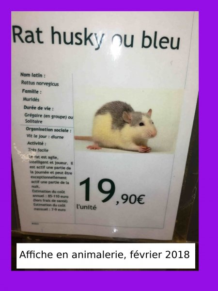 - mon côté Brigitte Bardot : franchement mes rates de rateries ont un caractère en or, elles sont vraiment adorables! Mais, quand vient le moment d'adopter et que je dois choisir entre des rates de raterie ou faire un sauvetage (mes albi sont des rates réhabilitées de laboratoire via whiterabbit), mon cœur balance vraiment, car même si ce seront surement des rats, moins "rares", moins calins ect, j'ai parfois vraiment mauvaise conscience à adopter des rates de rateries alors qu'ils existent des petites malheureuses qui ont mal commencé dans la vie à cause de ces s******* d'humains... D’ailleurs pour les autres espèces animales, la question ne se pose même pas, j'adopte toujours en refuge, les rats c'est vraiment l'exception à cause de leur foutue espérance de vie si courte et du fait que je tienne absolument à les faire stériliser avant leur 4 mois (pour quasi éliminer les risques de tumeurs mammaires).