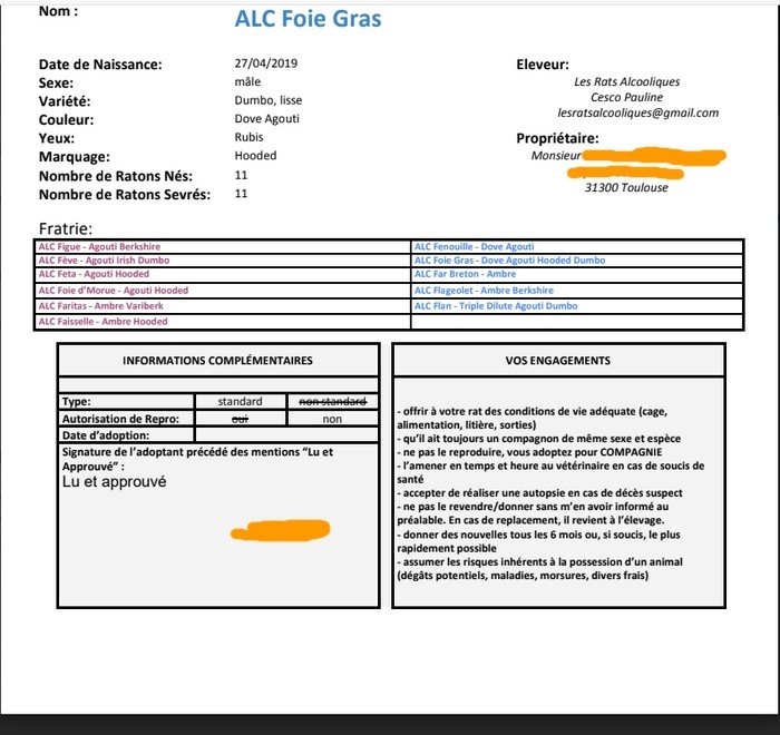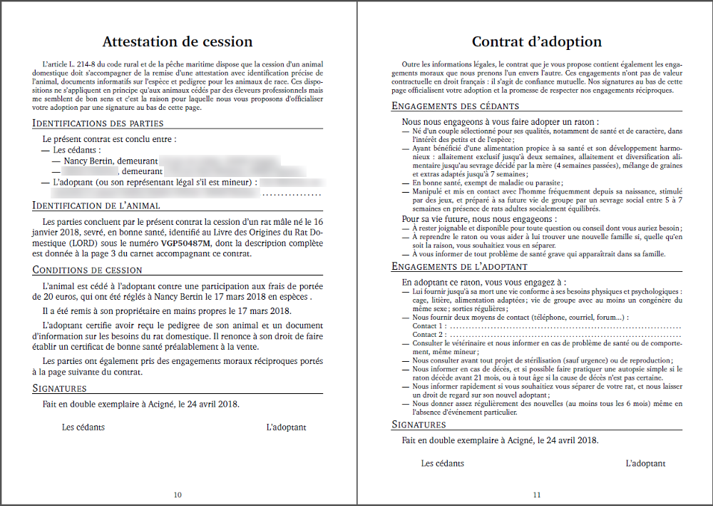 Pour info, le modèle de contrat de cession de ma raterie  - caviardé pour anonymisation mais le reste est d'origine - signé par une de ces personnes, devant moi. (Comme il n'est nulle part en public, ça permet de se rendre compte.) Et je pense que Becaria en a un du même genre. Le reste de mon carnet comprend identification, pedigree, conseils d'alimentation, courbe de poids, numéros utiles (dont le mien), etc.