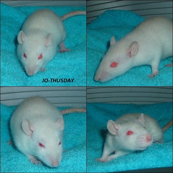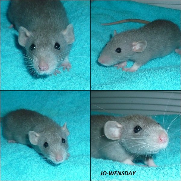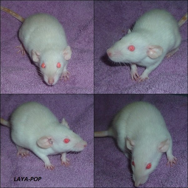 Date de naissance de la portée 08 juillet 2014 Nom du Père : TY-POP * Description : bleu russe uni dumbo lisse * Provenance : Il est né à la maison d'une femelle externe (LOLI-POP) et d'un mâle à moi (DARTY) * Généalogie: http://lord-rat.org/rats/rat_details.php?id=38590 * Numéro d'inscription au LORD: IND38590M * Date de naissance : 9 décembre 2012 * Poids à la saillie : 780g * Autres informations: TY-POP est un rat gentil qui à longtemps été le dominant de la cage mais sans créé de soucis. Il à récement été détronné de sa place de chef mais il ne semble pas mal le vivre. Il à eu un abcès sur le dos suite à une morsure mais c'est tout. Il ne souffre que d'obésité, ce qui n'est pas rien, mais qui ne pose pour le moment pas de soucis. Nom de la Mère : JOANNE Watson * Description : noir berkshire étoilée RED-Devil standard lisse * Provenance : Elle est né chez un éleveur de reptiles sur Tours, je sais peu de chose sur sa famille en dehors de la description de ses parents, mais j'ai malgré tout un suivi sur deux de ses soeurs, un frère, et une tante. * Généalogie: http://lord-rat.org/rats/rat_details.php?id=40393 * Numéro d'inscription au LORD: INC40393F * Date de naissance : 11 octobre 2013 * Poids à la saillie : 340g * Autres informations: Joanne est une femelle qui j'ai adopté par l'intermédiaire d'une amie. Pour des raisons de santé de cette dernière les covoiturages qui devaient avoir lieu ont souvent été annulé et je l'ai donc adoptée tardivement. Cependant dès son arrivée elle à été d'une gentillesse incroyable et d'une affection relativement débordante, elle s'est très vite fait à moi, avec des multitudes de léchouilles partout et avec un esprit bien posé dans sa tête !! Elle n'est pas dominante dans la cage, mais elle n'est pas non plus en bas de l'échelle, elle sais imposer sa placer sans violence et sa réintégration au sevrage des ratons c'est fait comme une lettre à la poste. La portée : * Nombre de petits : 10 à la naissance, 1 mort (tout petit) à Jour10 * Informations complémentaires : Cette portée est la première pour la branche des dilution (Devils, Burmèses, Siamois et dérivés) d'un mâle né à la maison sur ma branche qui ne connait pour le moment pas de soucis de santé, avec une femelle en bonne santé malgré ses origines qui ne permettent pas beaucoup de recul sur sa famille. C'est pourquoi je n'autorise pas la reproduction des femelles en attendant les 16/18 mois des mâles pour avoir un meilleur recul sur plus de rats (ici 9) et m'assurer de leur santé et caractère avant d'envisager la suite. Il reste à l'adoption : LAYA-POP femelle himalayenne dumbo lisse JO-THUSDAY mâle himalayen standard lisse JO-WENSDAY mâle bleu russe irish dumbo lisse * date d'adoption possible : Dès maintenant, la sociabilisation est une réussite * Participation financière demandée: 15€ * départements d'adoption possibles : 44 / 35 / covoiturage sérieux accèptés (à votre charge) * vos conditions d'adoptions : 1 - je fais remplir un questionnaire 2 - je fais signer un contrat d'adoption (avec interdit de reproduction pour la femelle) que je vous demande d'imprimer, de remplir et de me retourner par courrier (si l'on ne se voit pas en vrai) avec la participation financière des frais d'adoptions qui sont de 15€ 3 - je demande des nouvelles régulières, déjà pour savoir comment vont mes ratons, comment ils grandissent, comment ça se passe chez vous mais aussi après pour avoir un suivi de la lignée : que les nouvelles soient bonnes (on le souhait) ou mauvaises (malheureusement cela peut arriver) * Vos coordonnées : MP ou email : sid111@voila.fr