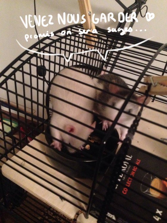 Bonjour à tous Après avoir cherché d'abord sur des sites de gardes d'animaux, sur lesquels je n'ai pas eu de réponse... je m'adresse à vous ! Je pars en vacances fin décembre, pour la périodes des fêtes pendant plus de quelques jours, je ne peux donc pas laisser mes deux ratounes seules à la maison. Il m'est impossible de les emmener puisque nous allons loger chez la grand mère de mon homme, je vous dis pas l'angoisse pour elle d'avoir deux rats dans la chambre d'amis ! Je cherche donc quelque qui aurait possibilité de mes garder mes deux ratounes pendant une semaine voire une semaine et demie, du 23 ou 24 décembre jusqu'à fin décembre ou début janvier. On a encore pas de date fixe pour notre retour de vacances, le seul impératif est le départ qui se fera le 24. Il est évident que la garde sera rémunérée. La litière, la nourriture, les accessoires, et même la cage si nécessaire, seront fournis. Je garde sous le coude un plan B, au cas où, mais j'aimerais mieux éviter ! Pour découvrir mes ratounes c'est ici