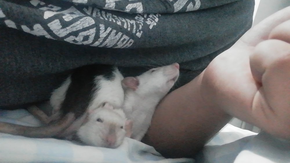 Je suis l'heureux papa de trois magnifiques petits rats, ils sont tous du 2 août 2018. Le noir et blanc, c'est Gunter, le plus peureux de la troupe. Viennent ensuite Edgar et Melchior, deux siamois. Edgar est le plus fin, très curieux, il se laisse à peu près porter et papouiller mais il en a vite marre. Melchior est le plus imposant, ça ne le dérange pas d'être papouillé surtout quand il mange mais déteste être porté ! Ils sont adorables, ils ne se battent pas (encore) et ce sont de vraies piles électriques !