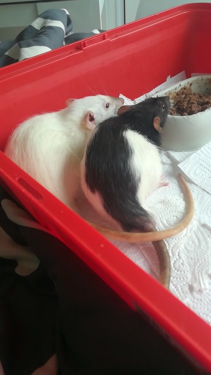 Bonjour à toutes et à tous. Je suis nouvelle ici et je me pose quelques petites questions. Voici mon histoire : je n'ai pas encore adopté de rats mais çane saurait tarder. Depuis le début de l'hiver mon compagnon et moi avons pris la décision d'adopter 2 petits mâles. Nous nous sommes beaucoup renseigné sur cet animal extraordinaire qui semblait vraiment adapté à notre mode de vie et nous avons ainsi découvert que c'était un animal grégaire très intelligent et affecteux. Nous avons donc dans un premier temps chercher si il y avait des rats en refuge à sauver prêt de chez nous (nous pouvons nous déplacer dans tous le Limousin et tout le Poitou-Charente) ; il n'y en avait pas ce qui peut être considéré comme une bonne nouvelle. Nous avons ensuite chercher une ratterie mais nous n'en avons pas trouvé non plus. Nous nous sommes donc rabattus sur les sites de petites annonces tel que leboncoin pour chercher nos futurs bébés sans beacoup plus de résultats. Nous voilà en Mars et nous avons réservés de jeunes ratons chez une dame : un raton dumbo rex husky noir et son frère un dumbo rex agouti/canelle (je pense canelle mock a vérifier). Cependant nous étions vraiment prêt à aller les chercher ce week-end (3/4 Mars) mais ils ne seront sevrés que dans 15 jours. Je me demande alors si il est possible vu que nous sommes en contact avec une autre personne de prendre un raton ailleurs (qui serait seul au départ du coup) ce week end et de faire ensuite une intégration avec les 2 autres précédée d'une quarantaine bien évidemment. Ça ferait que le rat aurait a vivre "seul" pendant presque 2 mois et j'ai peur qu'il déprime. En sachant que je serais toute la journée à la maison et que je pourrais passer énormément de temps avec lui. Je sais également que les intégrations ne sont pas toujours faciles avec les mâles. Vous pourriez me demander pourquoi dans ce cas la ne pas prendre 2 rats en premier lieu et prendre les 2 autres ensuite. Tout simplement parce que je pense que la cage que nous avons acheté est trop petite pour 4 rats. Merci de m'avoir lu jusqu'ici et de me donner vos avis Bonne journée à toutes et à tous. -
